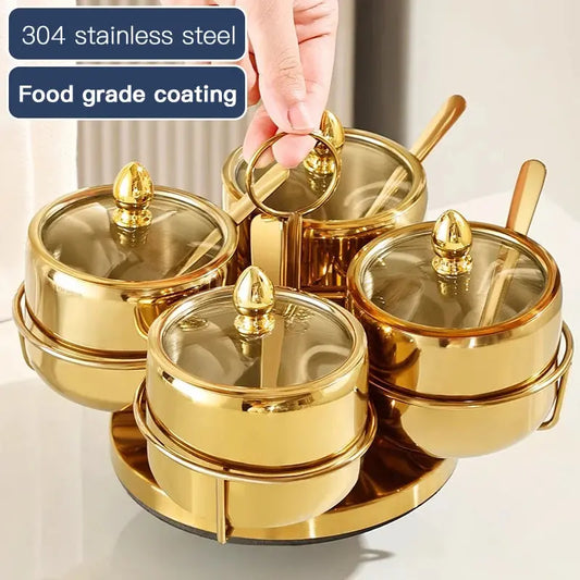 Luxury Golden 304 Stainless Steel Seasoning / Condiment Pot Set with Tempered Glass Lids, Matching Spoons & Storage Rack – Elegant Spice Containers with Food-Grade Coating – Ideal for Salt, Sugar, Spices & Condiments