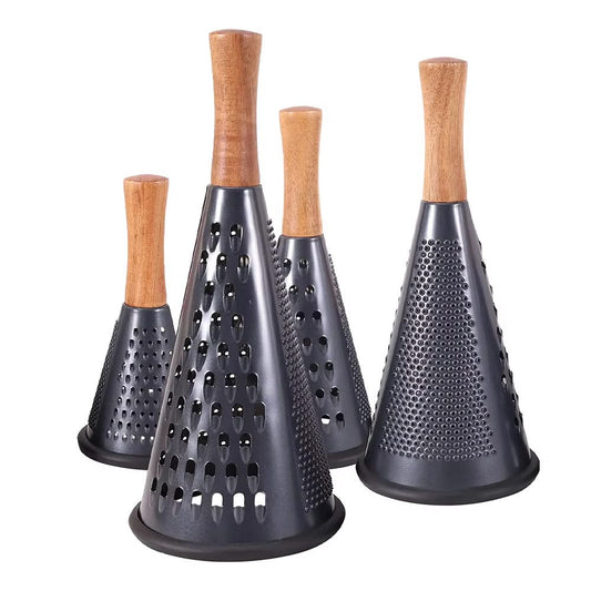 Modern Multi-functional Cone-Shaped Grater 3-Side with Wooden Handle – Ideal for Cheese, Vegetables, and Fruits in the Kitchen (Black), Available in 4 Sizes