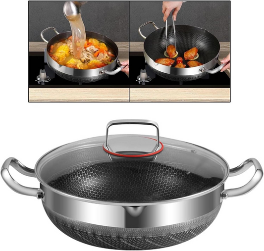 Honeycomb Stainless Steel Wok with Dual Handles β Multipurpose Food-Grade Non-Stick All-in-One 3-in-1 Design Combining Wok, Frying Pan & Soup Pot Functions