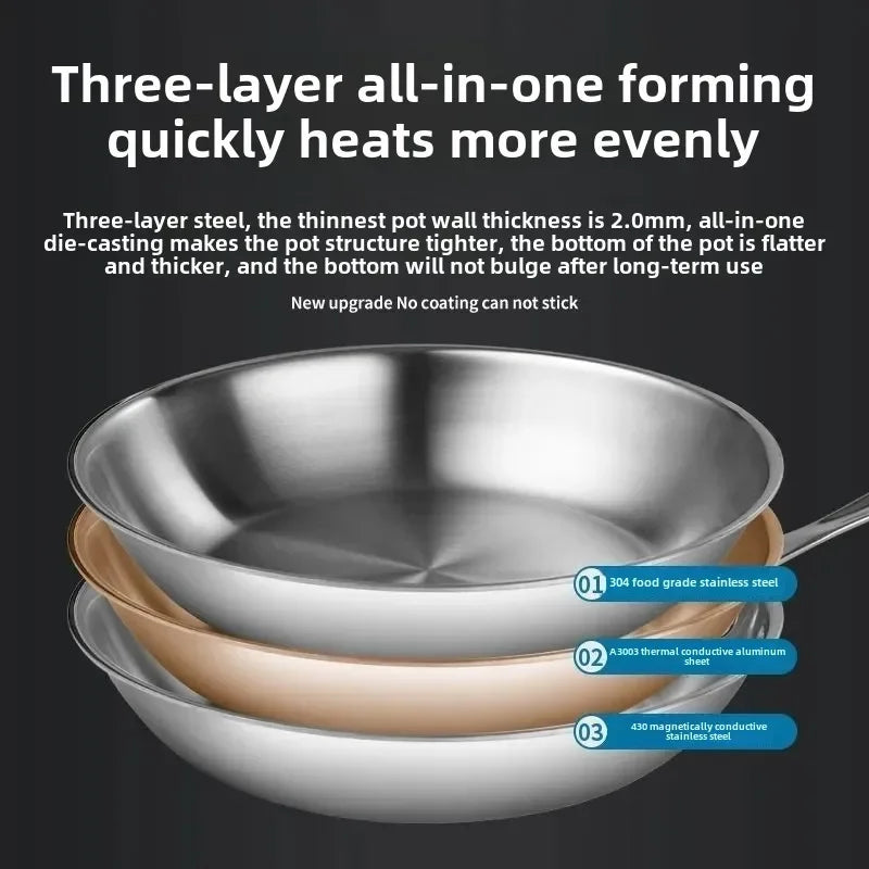 304 Stainless Steel Frying Pan with Long Handle – Uncoated Tri-Ply Skillet for Searing, Sautéing, Stir-Frying, Simmering & Pan-Frying Daily Meals – 3-Layer Pot Bottom – Induction, Gas & Electric Compatible – Available in 22cm, 24cm, 26cm, 28cm & 30cm