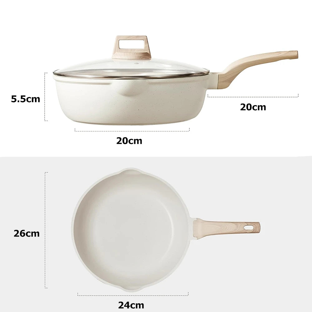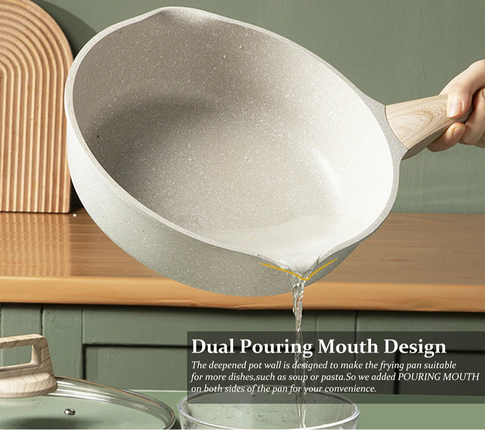 Granite Non-Stick Frying Pan with Glass Lid & Wood Grain Handle – Durable 3-Layer Cooking Skillet for Eggs, Pancakes, Searing, Sauces & Daily Meals – Dual Pouring Spout – Induction, Gas, Ceramic & Electric Compatible – Available in 20cm, 24cm, 28cm
