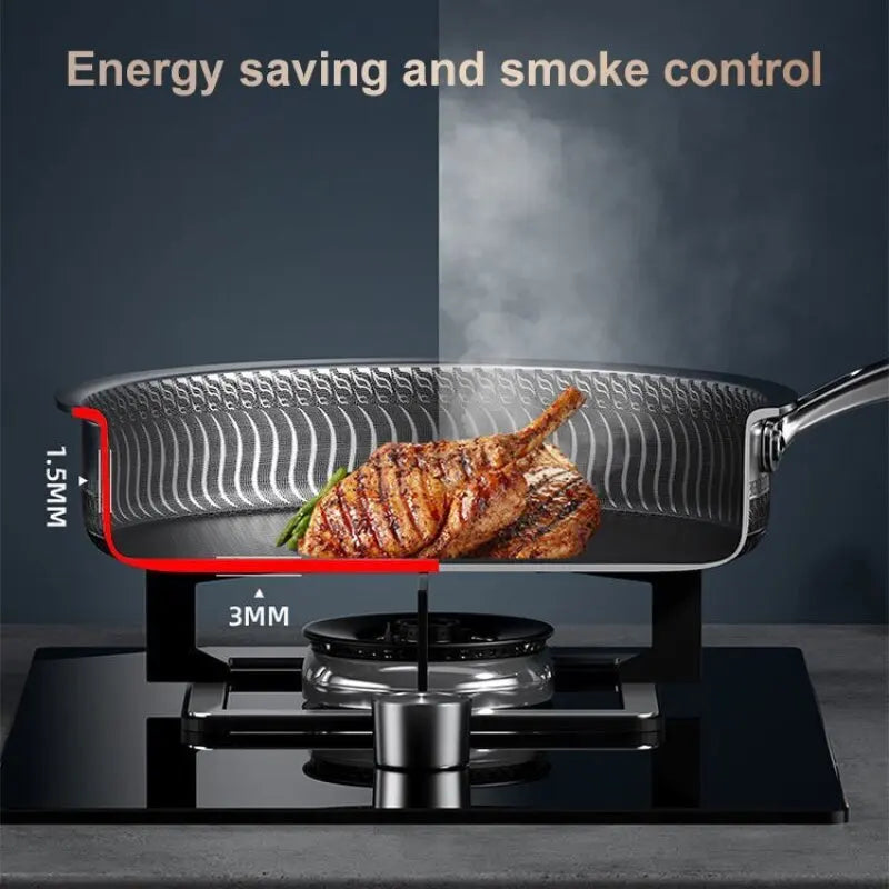 📦 Package Includes: 1 x Honeycomb Stainless Steel Frying Pan + 1 x Glass Lid